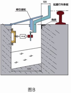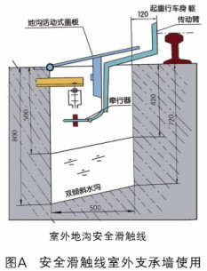 室外安全滑觸線(xiàn)地溝結(jié)構(gòu):垂直安裝圖A、側(cè)面安裝圖B、地溝活動(dòng)蓋板,每0.5米/塊蓋合整個(gè)地溝,支架為基建時(shí)一次性建筑。