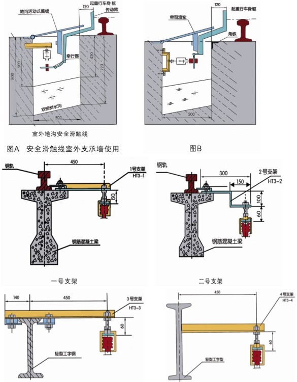 室外安全滑觸線地溝結(jié)構(gòu):垂直安裝圖A、側(cè)面安裝圖B、地溝活動(dòng)蓋板,每0.5米/塊蓋合整個(gè)地溝,支架為基建時(shí)一次性建筑。